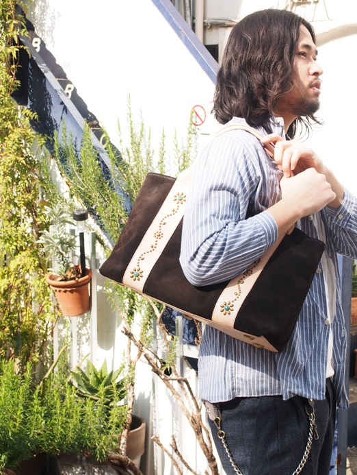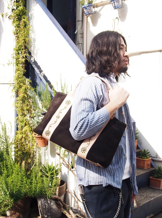 帯の部分にはアメリカ産天然ターコイズを使用したフラワースタッズを打ち付け、革の重厚感の中に